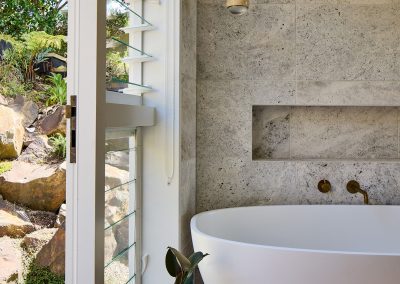 The ensuite is all about the connection to the landscaping with Breezway® Louvre Windows and a door to the outside to further connect this space to the adjacent garden. The stone and tiles are natural and tactile again blurring the lines between inside and outside. Terracotta tiles on the floor bring a natural warmth and feel amazing underfoot and the bath has been located for a sneaky view of the estuary.
