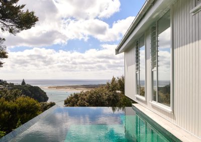 The Mangawhai house by Dorrington Atcheson Architects has been designed like a ribbon and unfolds as it steps down the site. Each level has been positioned to relate to the site around whilst maximising views. The main living spaces and master bedroom in particular are designed facing towards the amazing view.